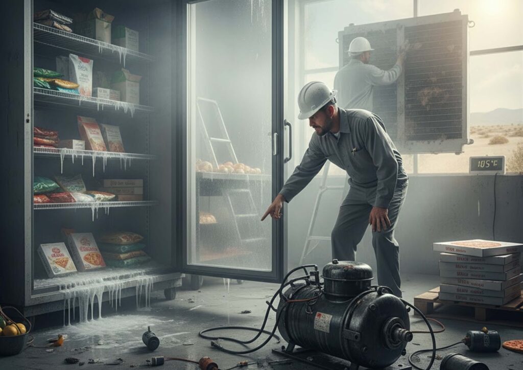 Operating a failing compressor increases the risk of total system damage and inventory loss. Immediate professional inspection is recommended.